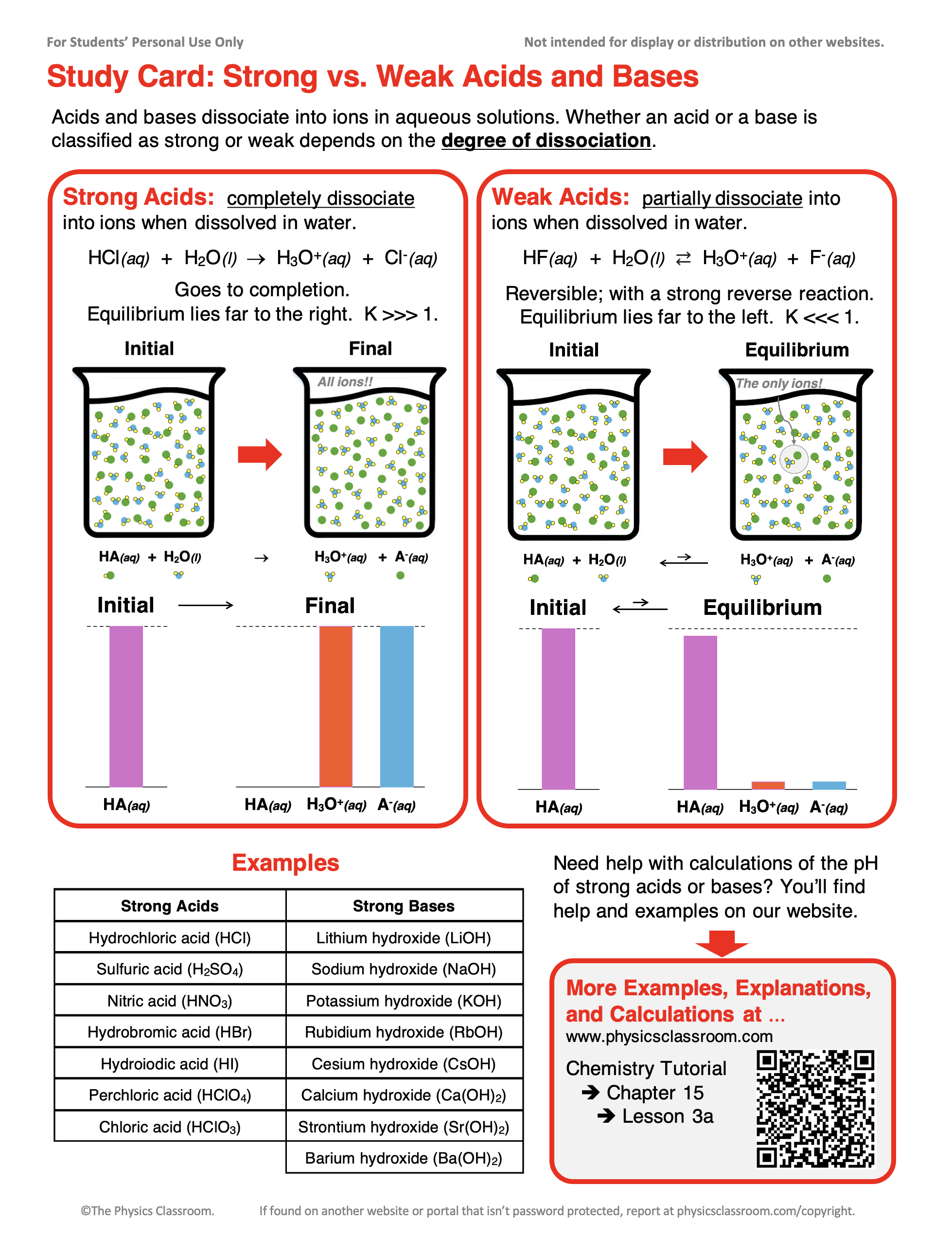 Strong acids and bases are substances that completely dissociate into ions in water, while weak acids and bases only partially dissociate, creating an equilibrium between undissociated molecules and ions. This Chemistry Tutorial page presents the details regarding the differences between strong and weak acids and bases.