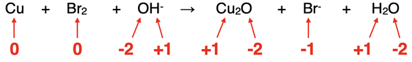 Cu + Br2 + OH- → Cu2O + Br- + H2O
