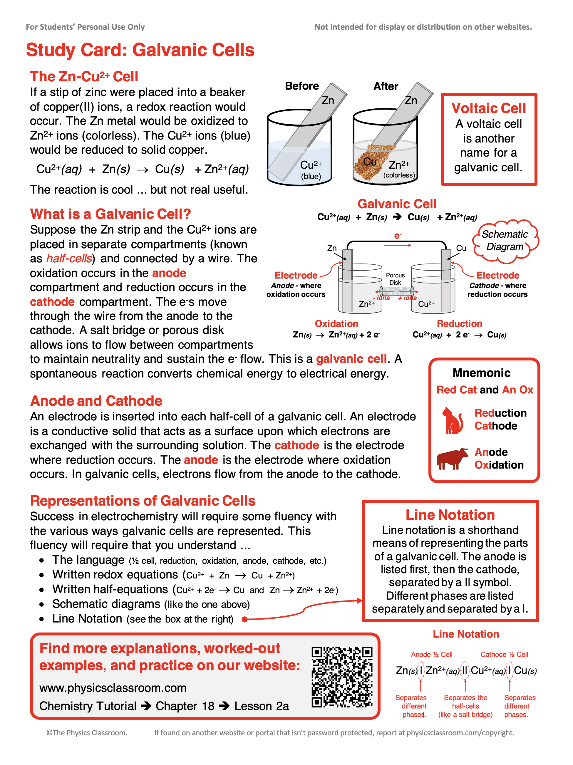 - Download our Study Card on Galvanic Cells. Save it to a safe location and use it as a review tool.