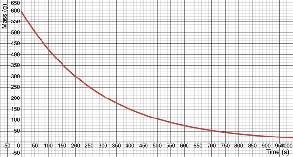 Trial 1 (in blue): The mass decreased from 240.0 g to 120.0 g between the times of 0.0 s and 150.0 s. This is consistent with a t