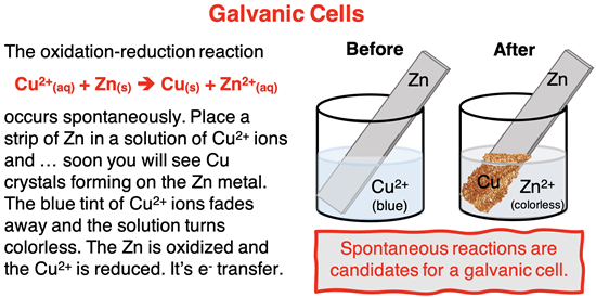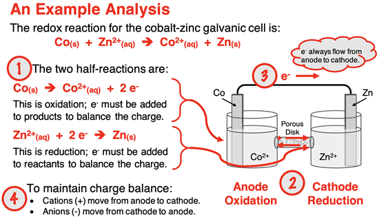 Study the graphics below in order to learn about galvanic cells and diagrams for galvanic cells. Give ample attention to the An Example Analysis section.