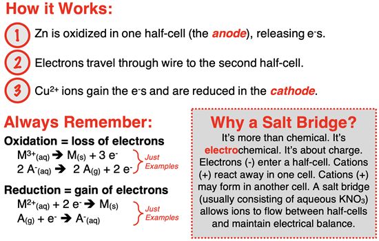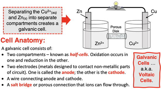 In a galvanic cell (or voltaic cell), the oxidation and reduction half-reactions occur in separate compartments known as half-cells. Electrons flow through a wire from the electrode where oxidation occurs (known as the anode) to the electrode where reduction occurs (known as the cathode). A salt bridge or other porous passageway between half-cells is used to facilitate ion flow and maintain electrical neutrality between the two half-cells.