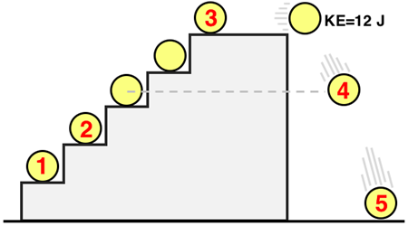 Consider the 5-step staircase. All steps provide an equal elevation gain. The potential energy (PE) on the 4thstep is 36.0 J. Determine the PE and KE values of the ball at the indicated positions.