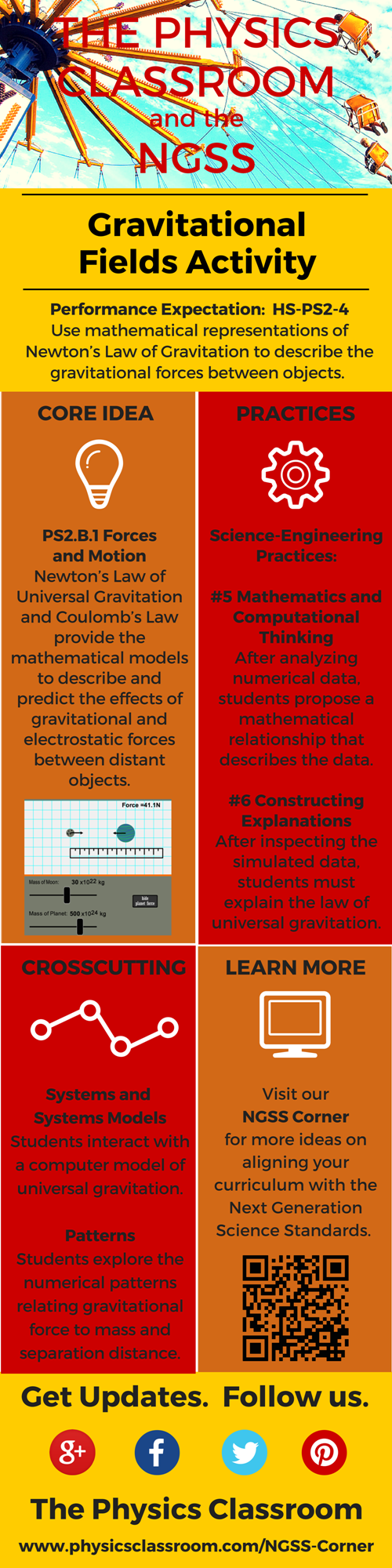 Gravitatonal Fields Interactive is located in our Physics Interactives section. The simulation engages students in an interactive exploration of the variables affecting the universal gravitation force. The Interactive is accompanied by a classroom-ready activity sheet that can be distributed to students. The infographic below describes the manner in which it aligns with Next Generation Science Standards.