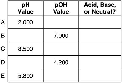 Express your understanding of pH, pOH, and the identity of a solution as being acidic, basic, or neutral by completing the table.