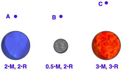 Three locations – A, B, and C - are shown. Each has a different set of gravitational conditions. The relative planet mass (expressed in terms of M) and the relative distance of each location from the planet's center (expressed in terms of R) are shown. Rank the three locations according to their gravitational field strength.