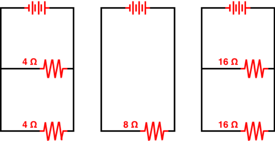 Suppose there is a circuit with two 12-Ω resistors with a parallel arrangement. Any given charge circulating through the circuit will only pass through one of these resistors. Half the circulating charge will pass through one resistor and half will pass through the other resistor. In such a parallel arrangement, the two 12-Ω resistors have a combined effect of 6 Ω. It's odd math, but for parallel circuits 12 Ω and 12 Ω is equivalent to 6 Ω. Similarly, 10 Ω and 10 Ω in parallel are equivalent to 5 Ω.