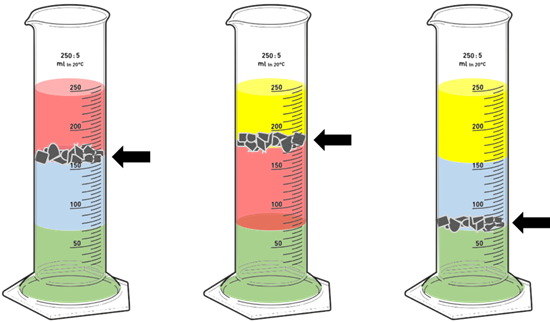 Four different liquids are used to prepare different density columns. Then three samples of household objects are shredded and dropped into each column. The diagrams show where the shredded materials settle. Rank the samples according to their density.