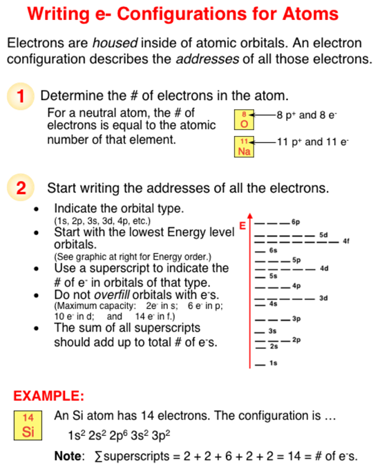 Electron configurations describe the location of electrons in the orbitals of atoms. The infographic below describes how to write such an electron configuration for an element.