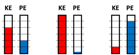 The total mechanical energy is the sum of the kinetic energy and the potential energy. As discussed in the Force and Energy section, the total amount of mechanical energy is conserved. So the sum of KE and PE should be a constant value. It reasons then that as the potential energy decreases, the kinetic energy will increase. And as the potential energy increases, the kinetic energy will decrease. By putting this information together with the information in the Potential Energy section, you should be able to determine how the kinetic energy is changing as the pendulum bob moves along its circular arc.