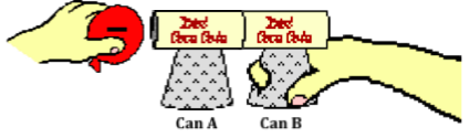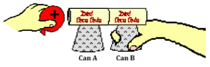 A charged object is brought near to a neutral object (can A) which is touched to a third object (can B).